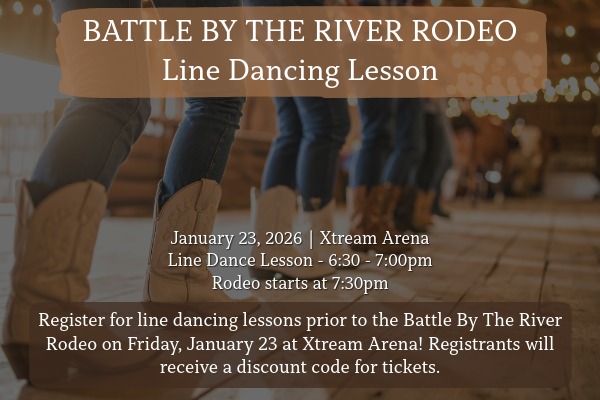 Please register for a line dancing lesson, taking place prior to the Battle By The River Rodeo at Xtream Arena on Friday, January 23, 2026.